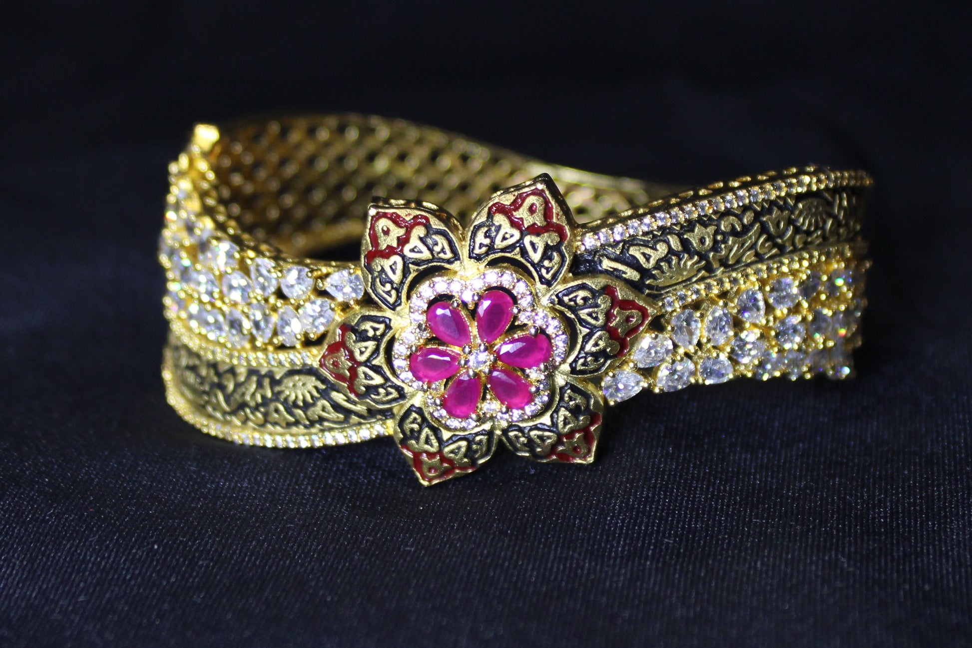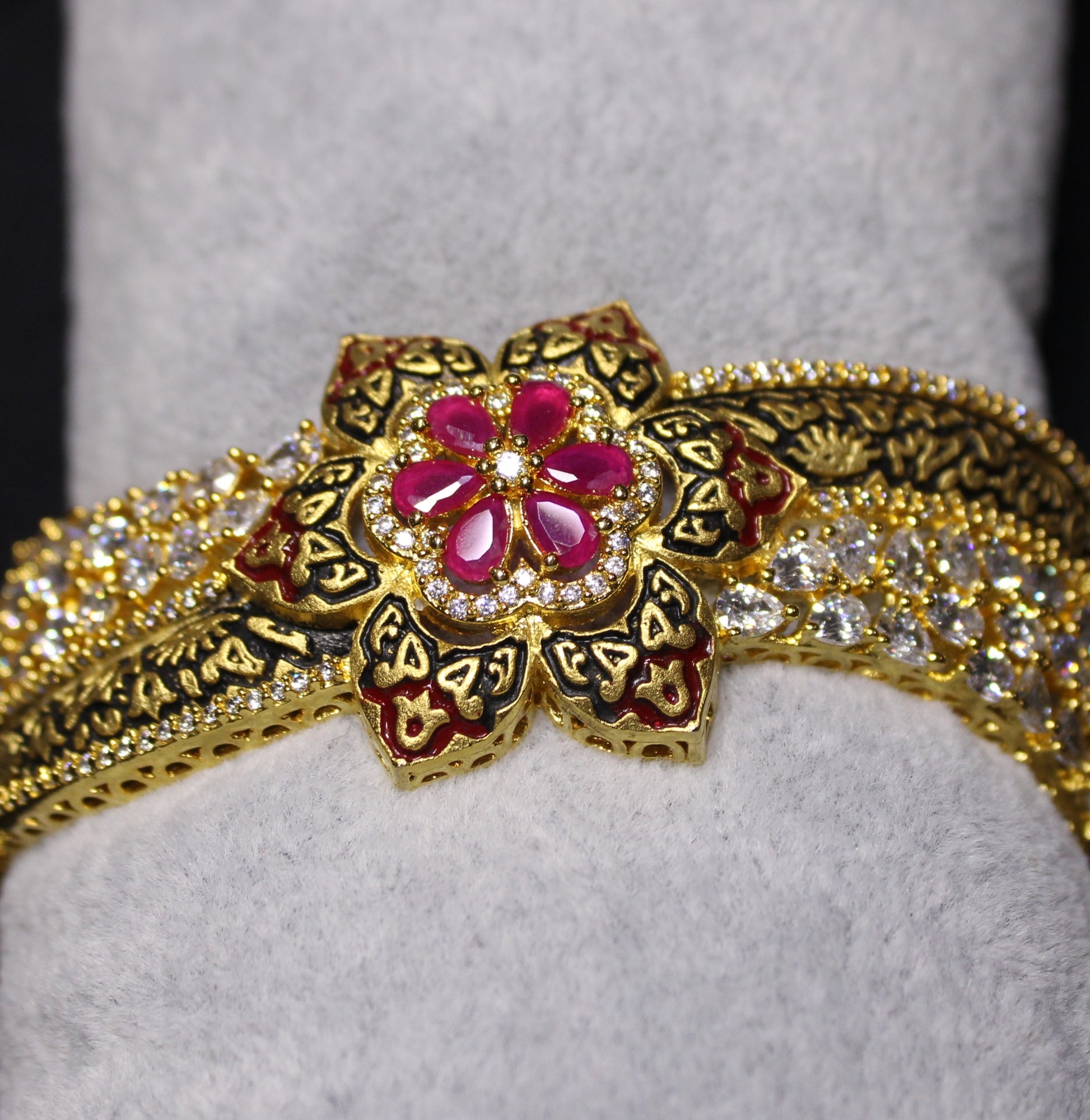 This stunning 18k gold-plated bangle showcases pear rubies, diamonds, and a floral design.