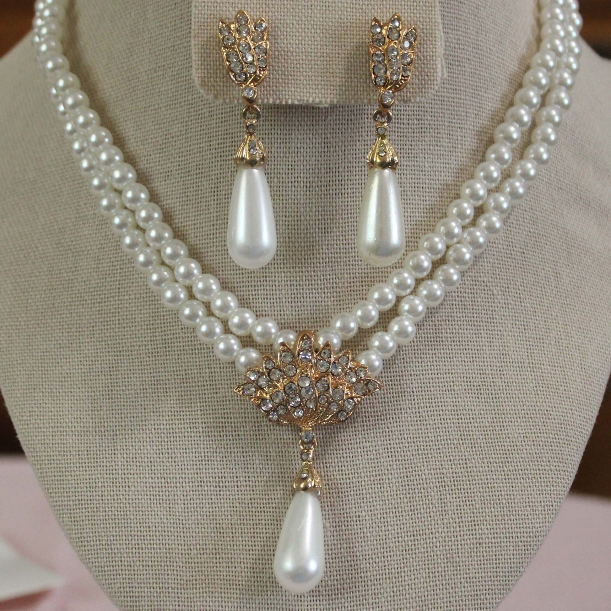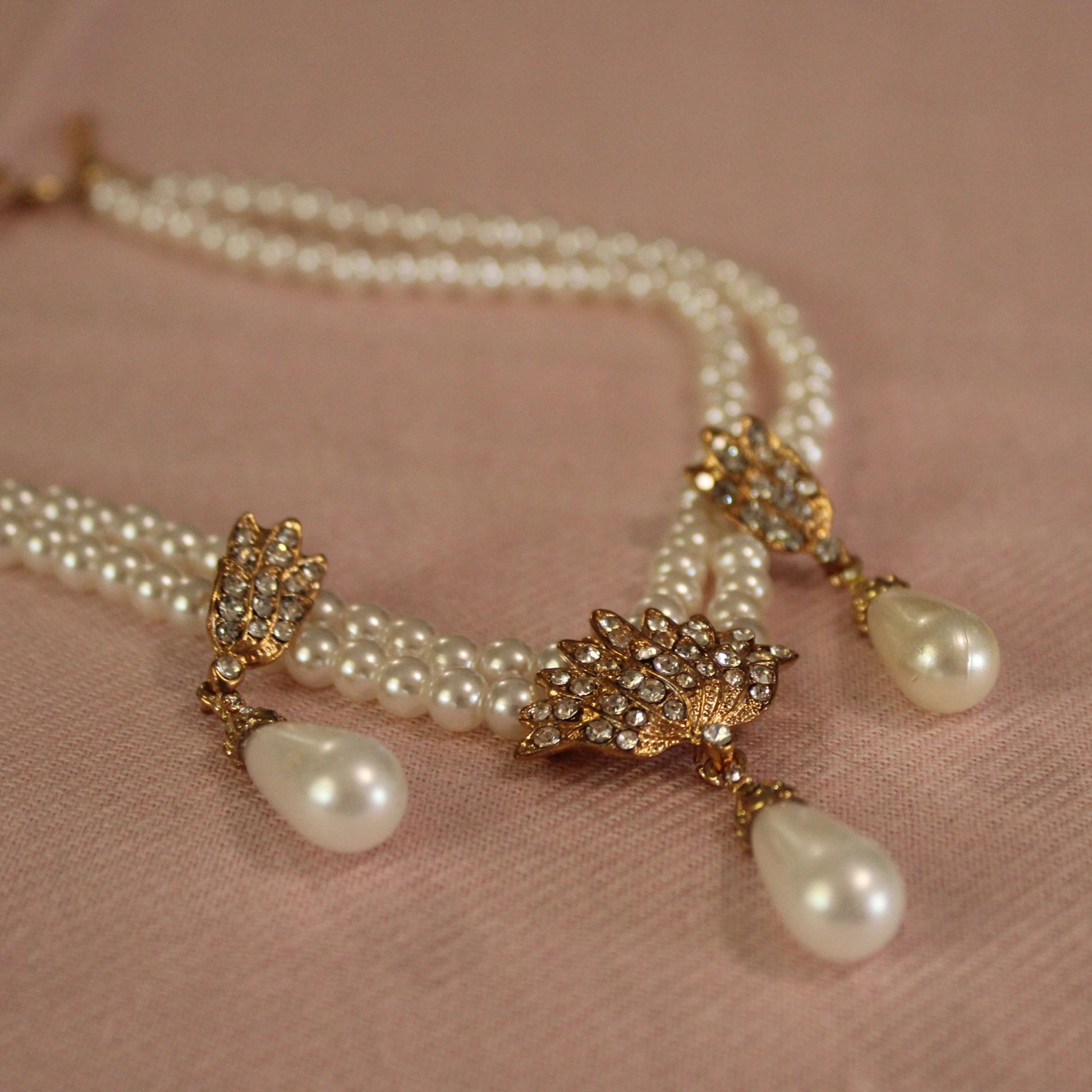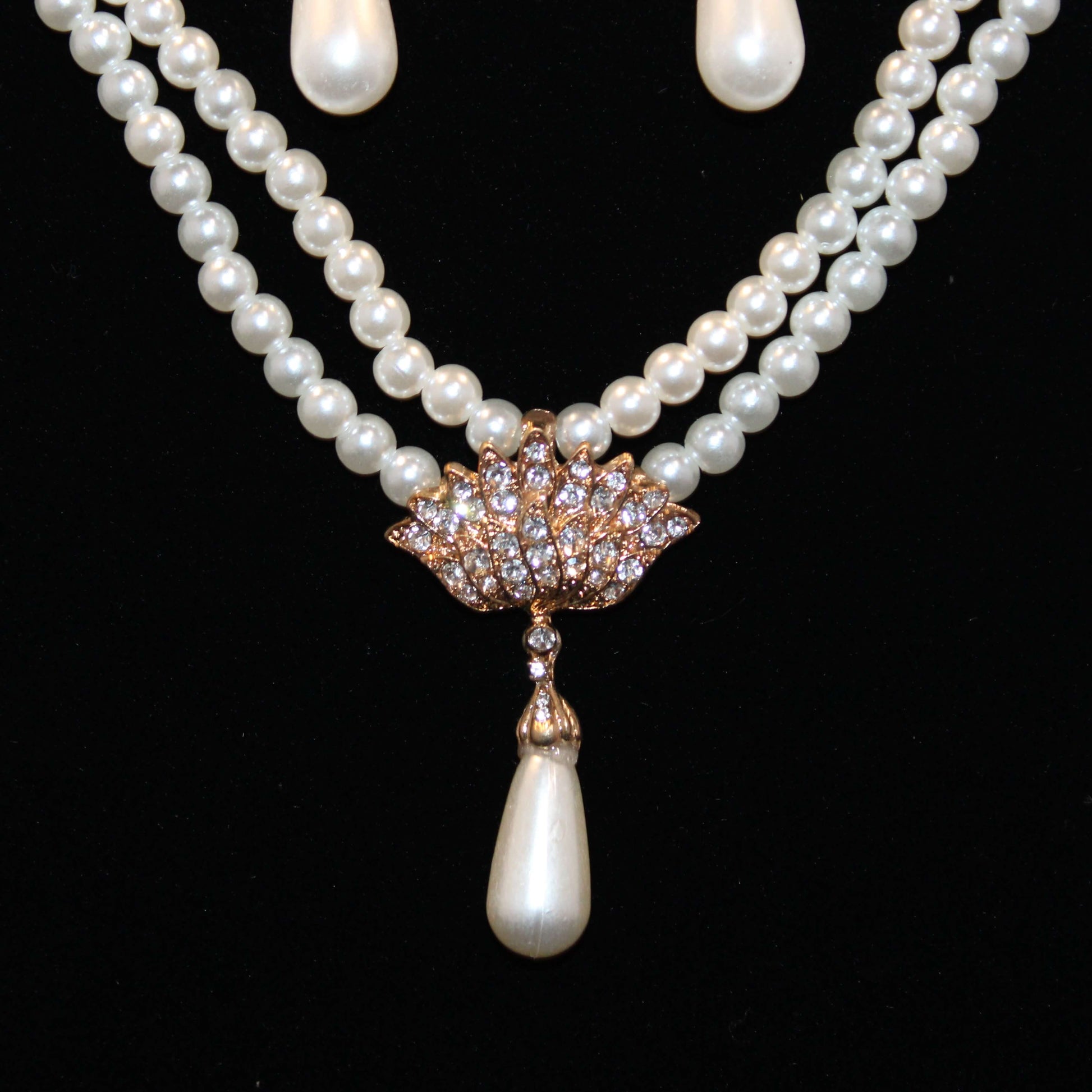 - Two strands of white pearls join a gold plated and diamond peacock feather, finished with a teardrop pearl.